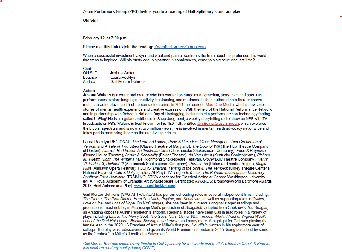 RECENTLY PAST ZOOM READING OF GAIL SPILSBURY'S "OLD STIFF"